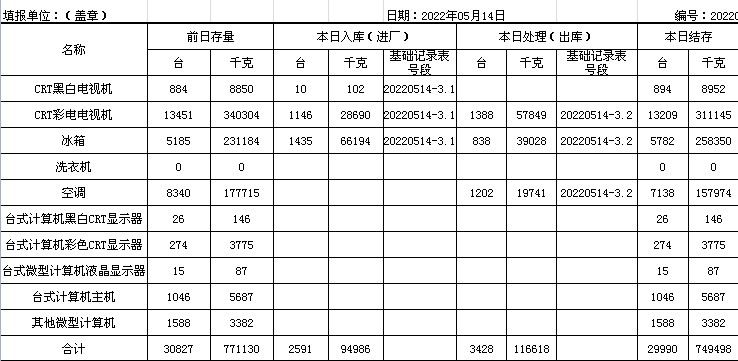 2022.05.14回收拆解統(tǒng)計(jì)表