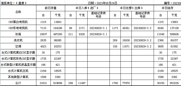 2023.08.29回收拆解統(tǒng)計(jì)表