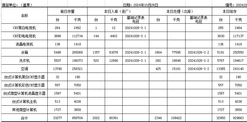 2024.10.26回收拆解統(tǒng)計(jì)表
