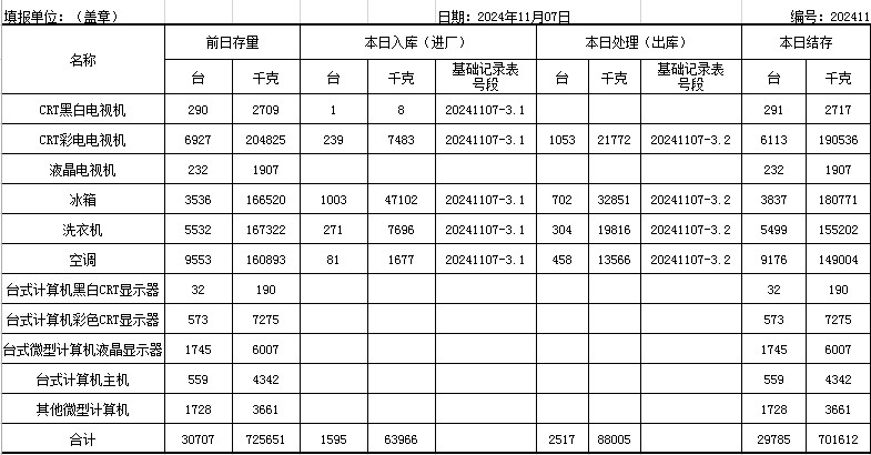 2024.11.07回收拆解統(tǒng)計(jì)表