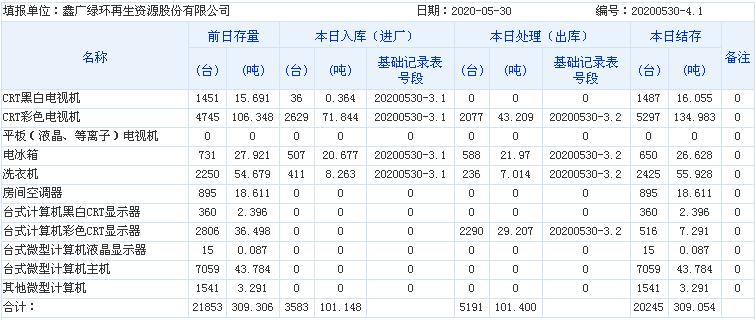 2020.05.31回收拆解統(tǒng)計(jì)表