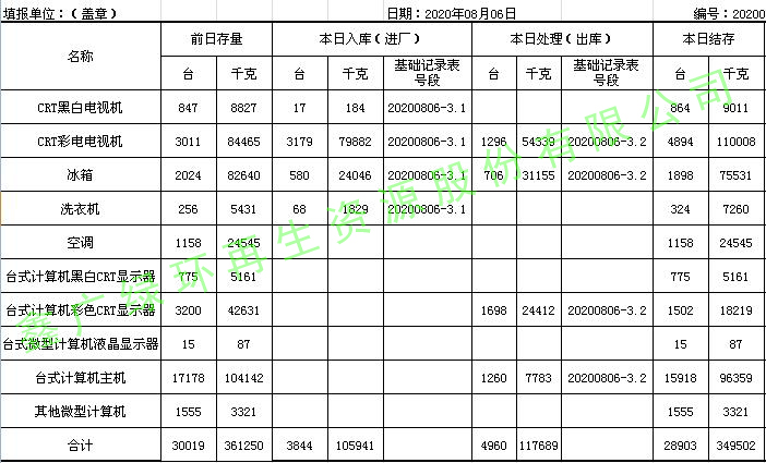 2020.08.06回收拆解統(tǒng)計(jì)表