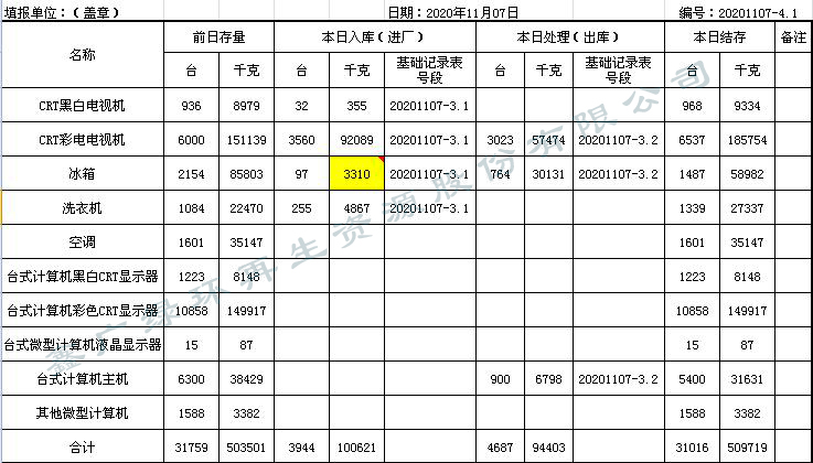2020.11.7回收拆解統(tǒng)計(jì)表