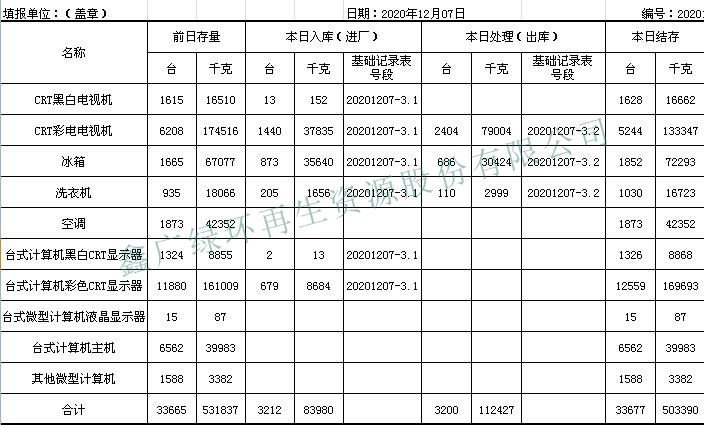 2020.12.07回收拆解統(tǒng)計表