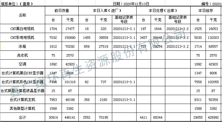 2020.12.13回收拆解統(tǒng)計(jì)表