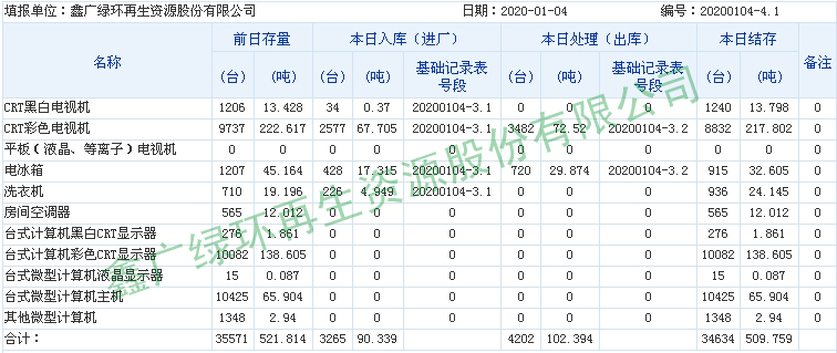 2020.01.04回收拆解統(tǒng)計表