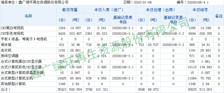 2020.01.06回收拆解統(tǒng)計(jì)表