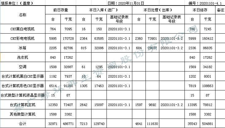 2020.11.1回收拆解統計表