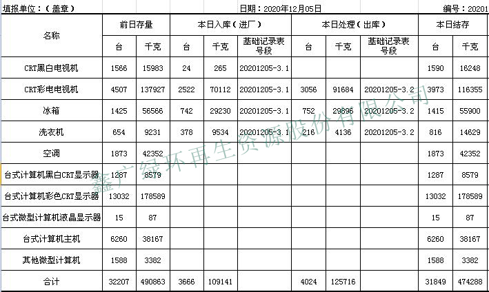 2020.12.05回收拆解統(tǒng)計(jì)表